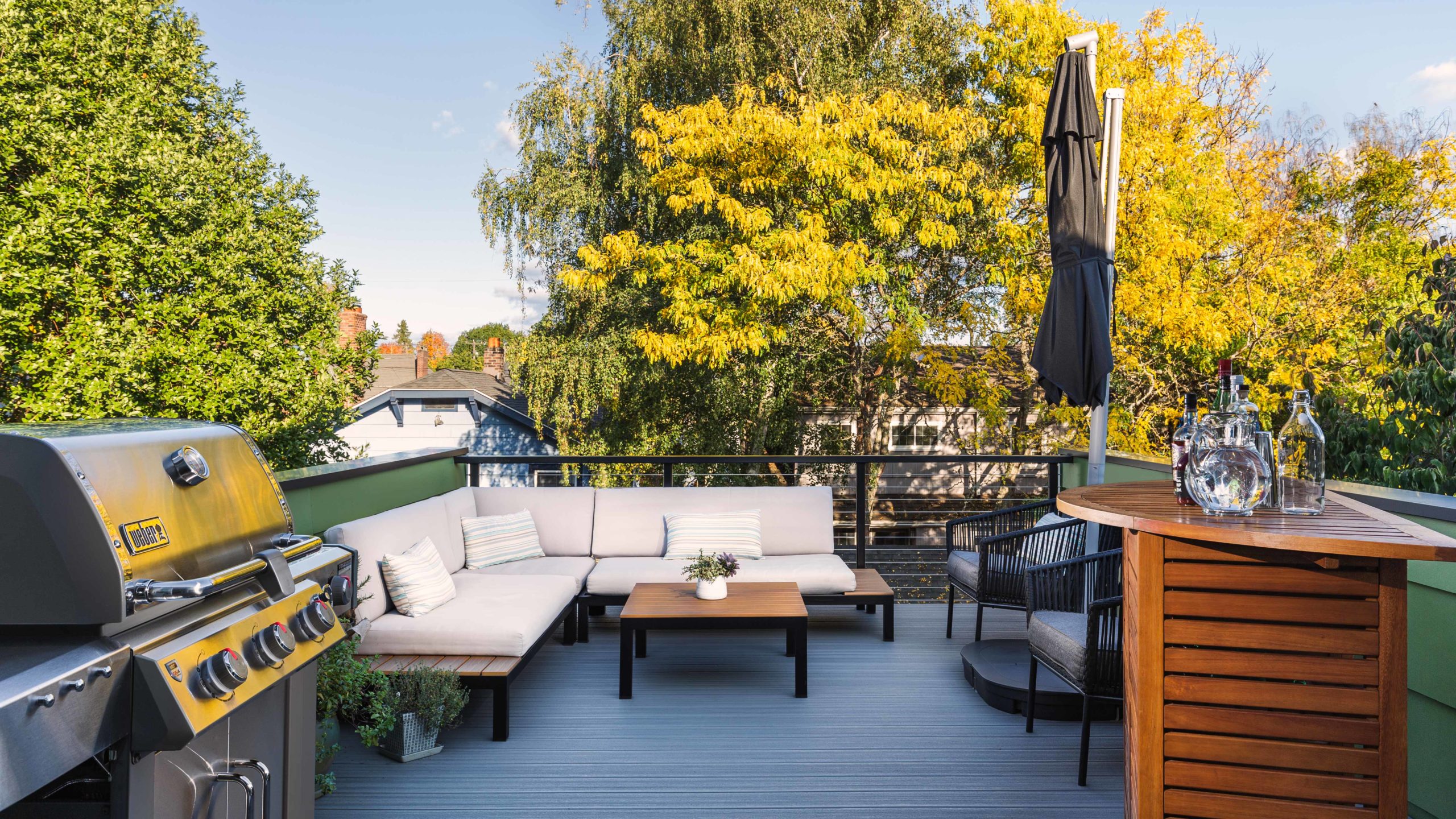 To accommodate the homeowner’s love of cars, we added a new garage on the back, with a rooftop deck that spills down to the back yard. The new stairs are bordered by a screen which will slowly be overtaken by star jasmine. A heat pump was hidden, with great effort, under the stair landing.