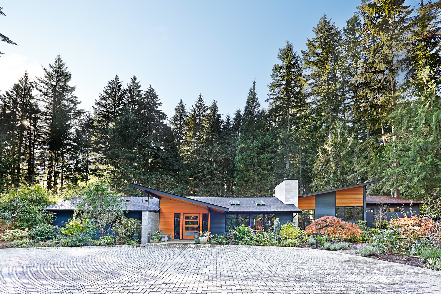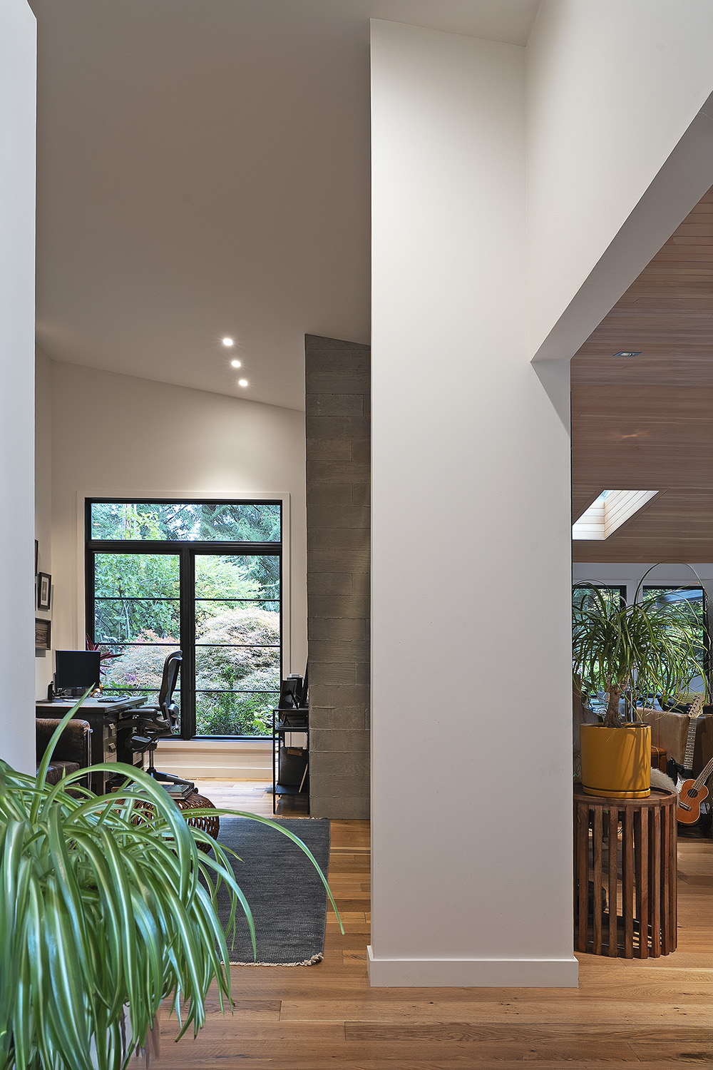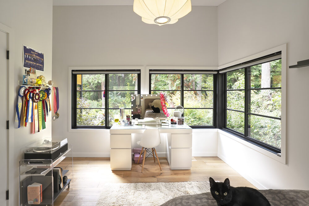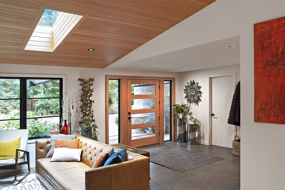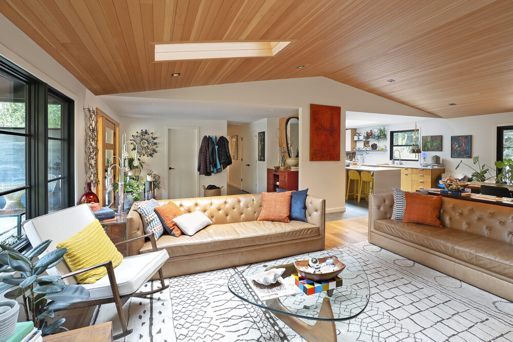 The DNA of the original rambler remains legible, but the expanded form reframes its relationship to the site. Rather than erasing the ranch house or deferring to it, the addition establishes a thoughtful dialogue between old and new. Large windows and vaulted ceilings open the home to the surrounding greenery, creating a continuous visual and spatial connection to the forest beyond.