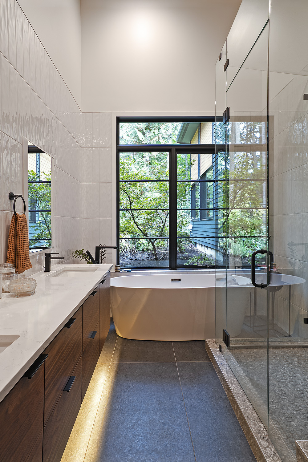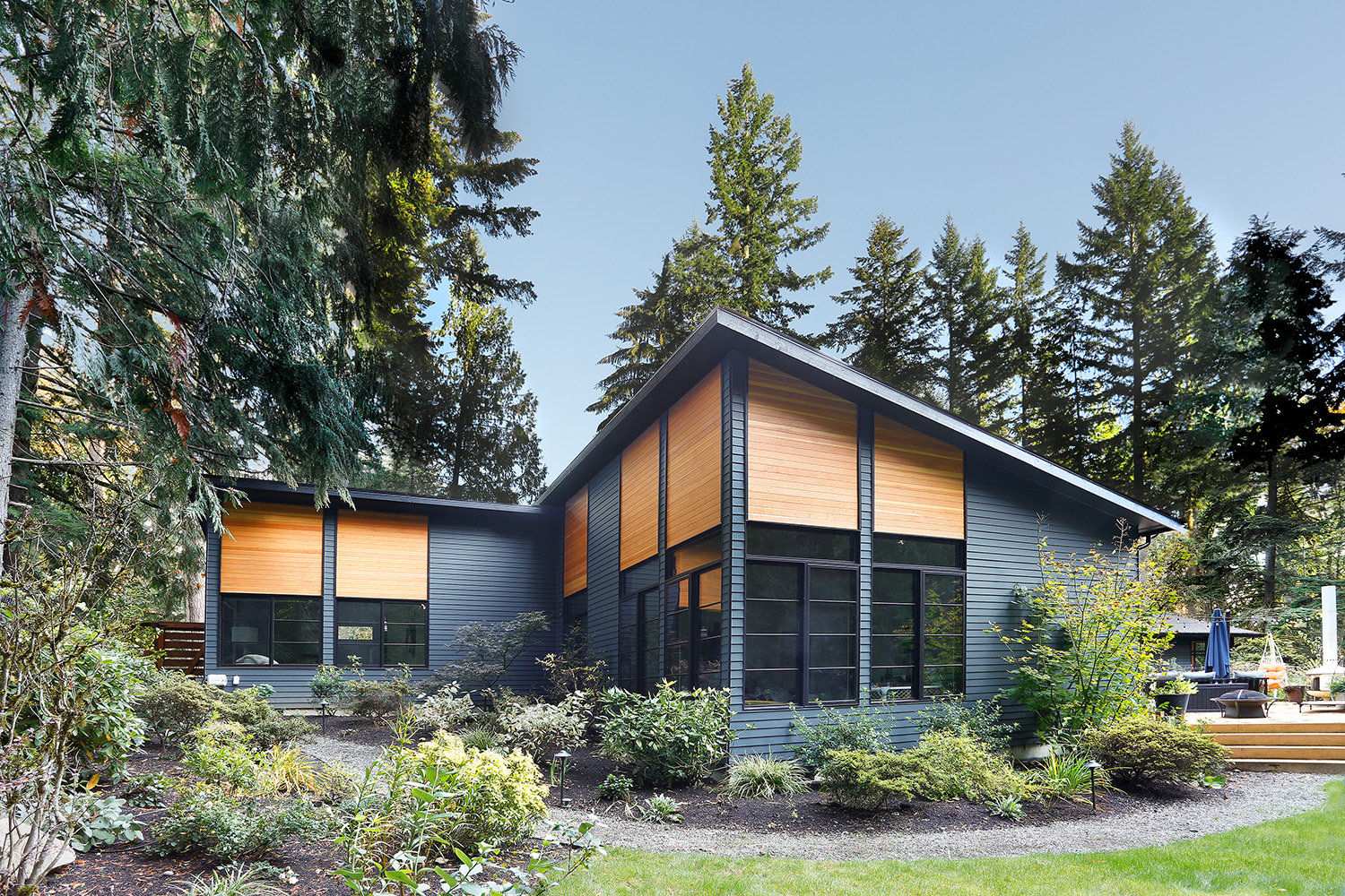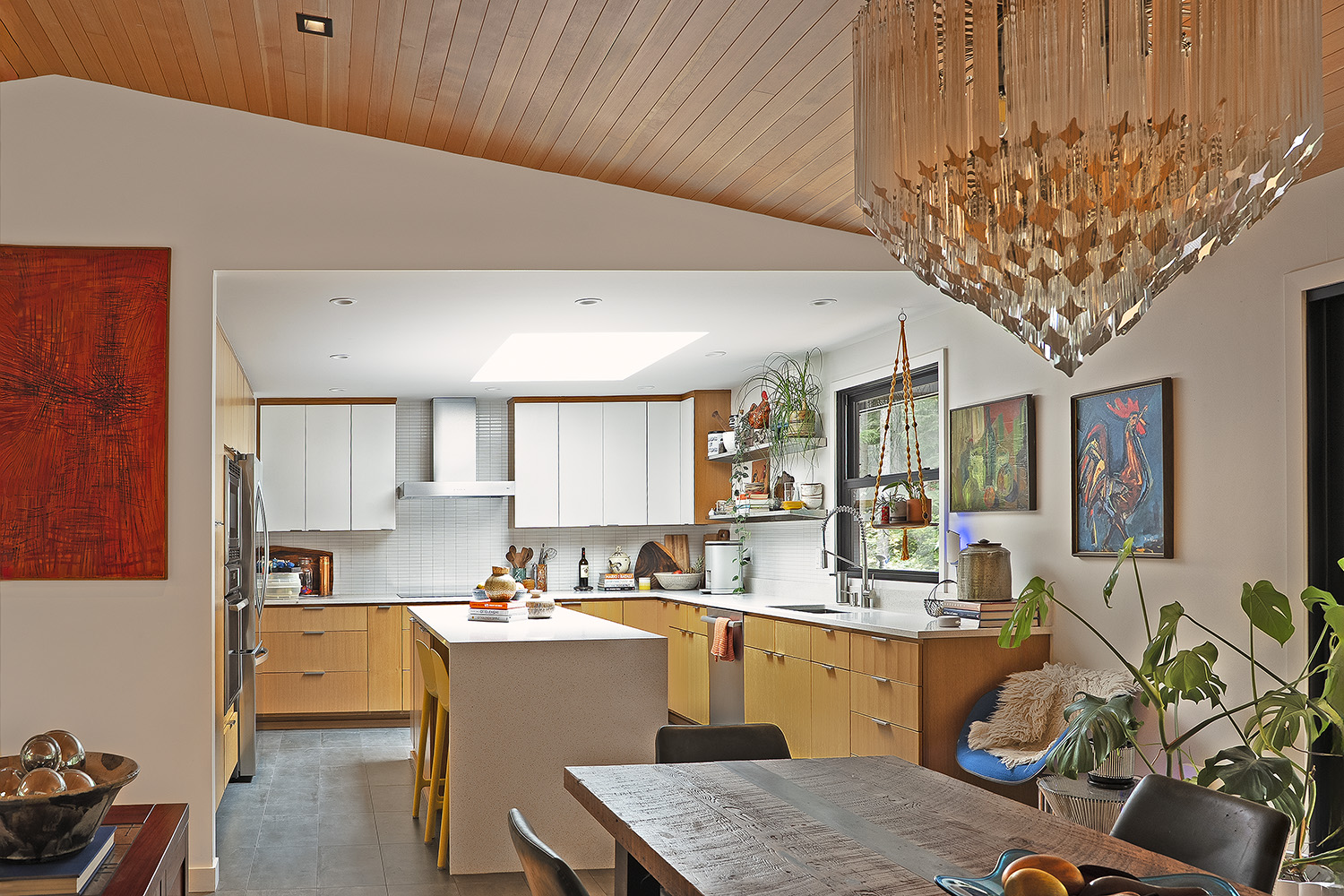 The DNA of the original rambler remains legible, but the expanded form reframes its relationship to the site. Rather than erasing the ranch house or deferring to it, the addition establishes a thoughtful dialogue between old and new. Large windows and vaulted ceilings open the home to the surrounding greenery, creating a continuous visual and spatial connection to the forest beyond.