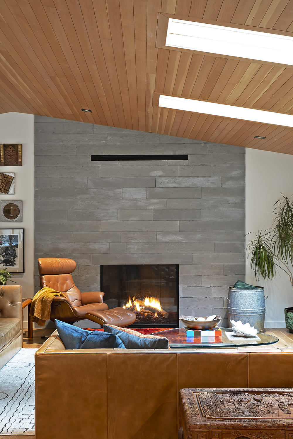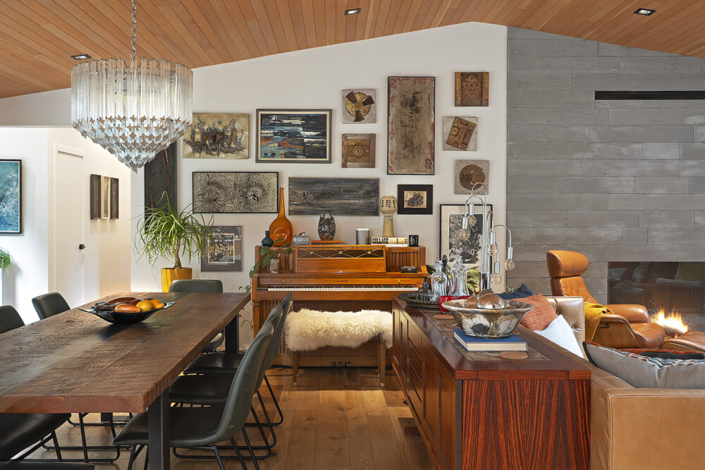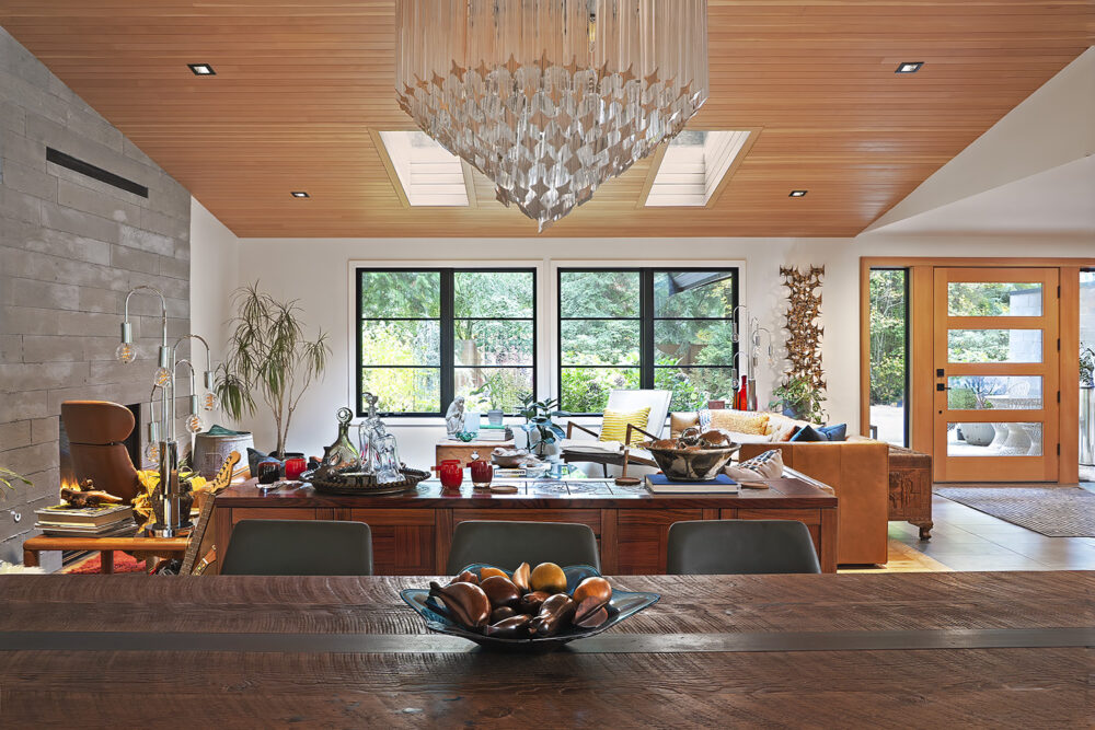 This low, hovering shelter provides a protective space for our client’s deeply personal approach to interiors. An avid collector and estate-sale enthusiast, she filled the home with richly layered furnishings, textures, and artifacts that bring warmth and narrative depth to the architecture. The result is a refreshing departure from the minimalism architectural practice often promotes—more akin to the lived-in richness of the Eames House than to a curated showroom selling Eames products.