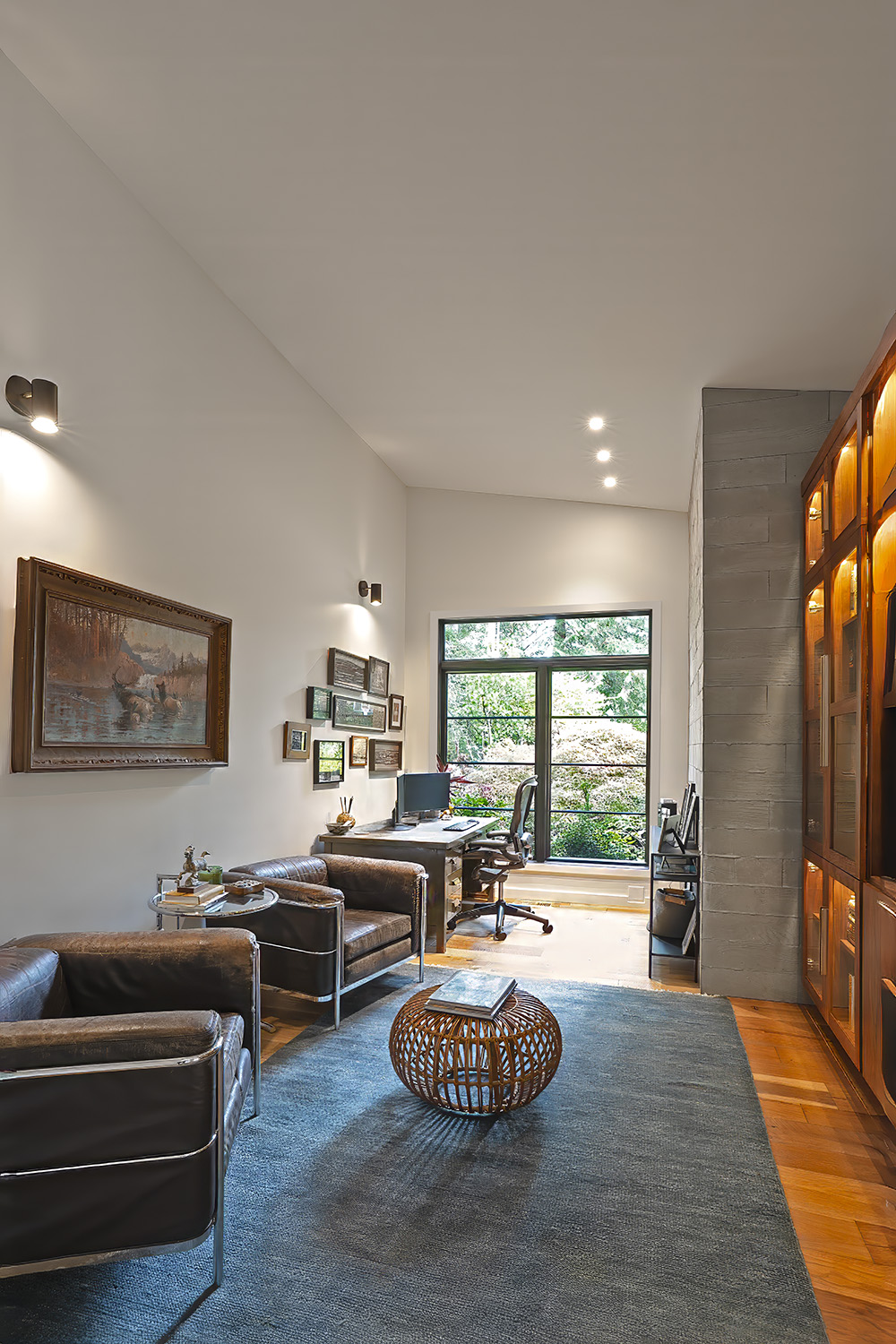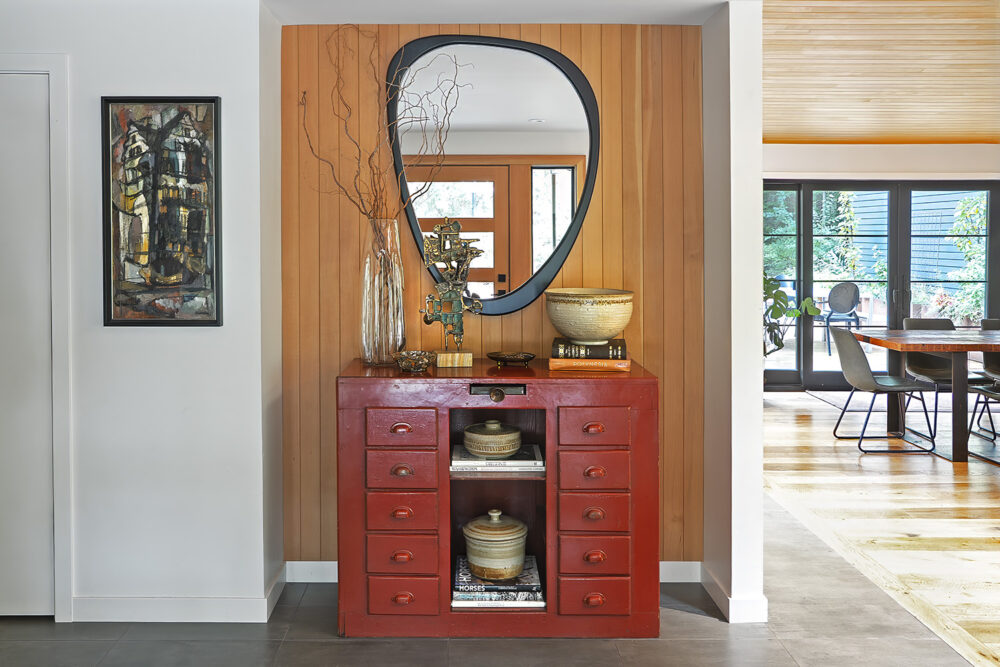 Some of the best spaces happen slowly. What began as a simple request to expand a rambler for a growing family evolved over the years into a complete transformation that honors the owner’s passion for vintage collecting and the home’s forested surroundings. Set among towering fir trees, our design carefully extends the original house into the landscape, allowing the architecture to hunker low beneath the forest canopy. While a palimpsest of the original tract house remains, the focus is more on maintaining the site’s defining feature—the quiet character of the wooded acreage.